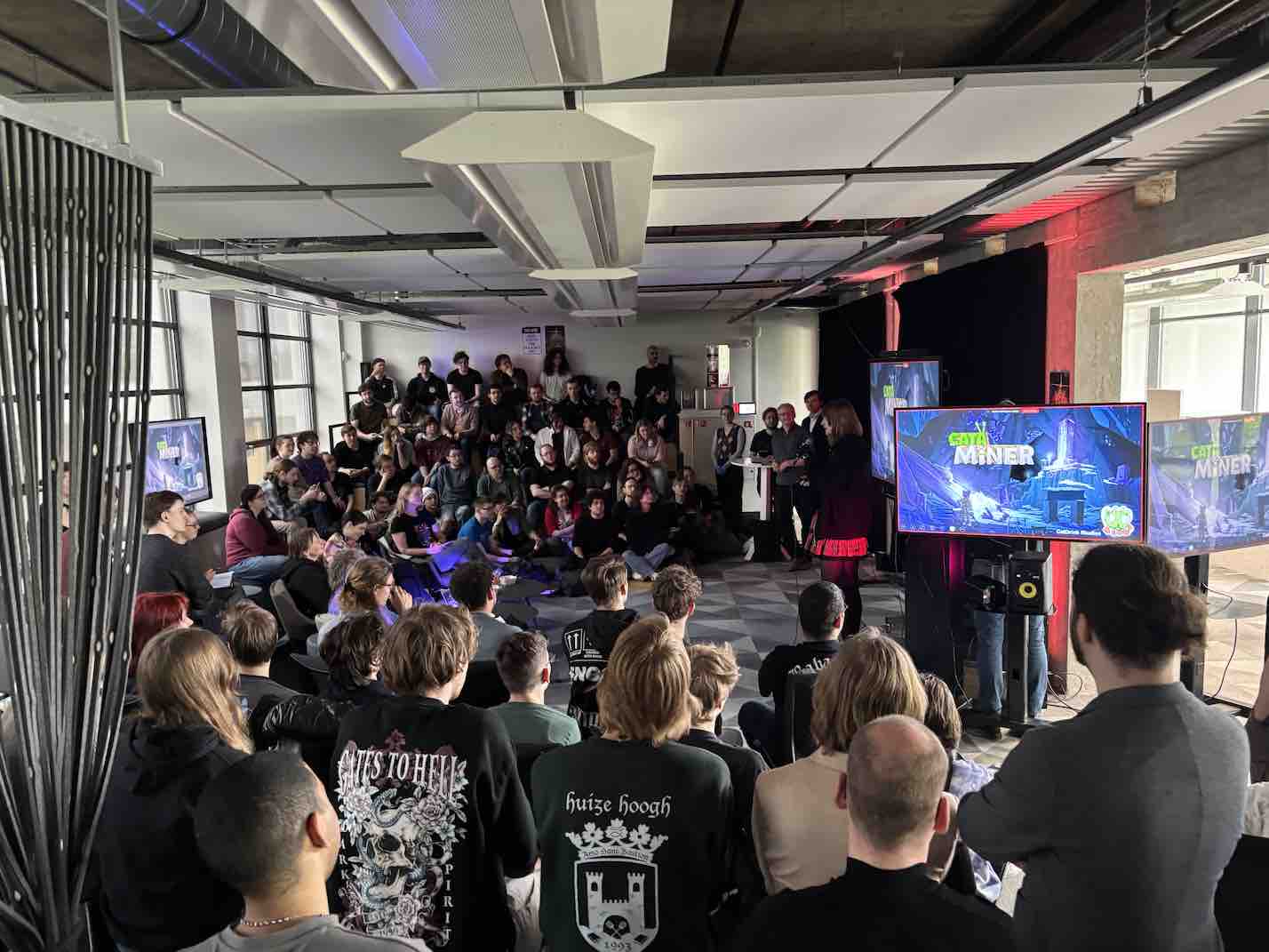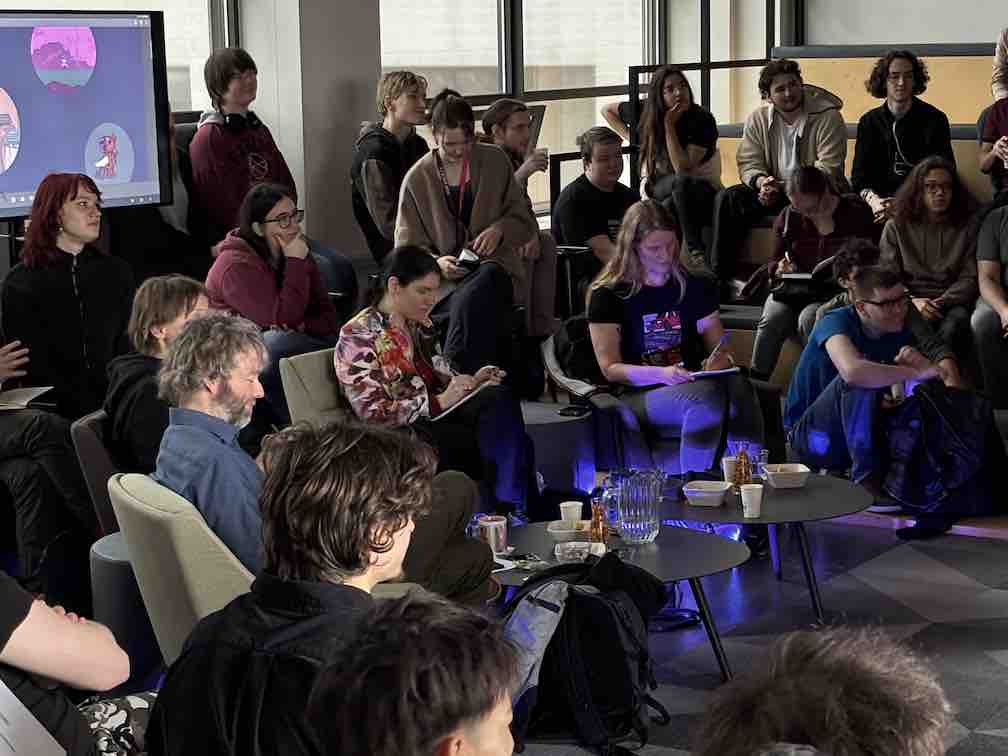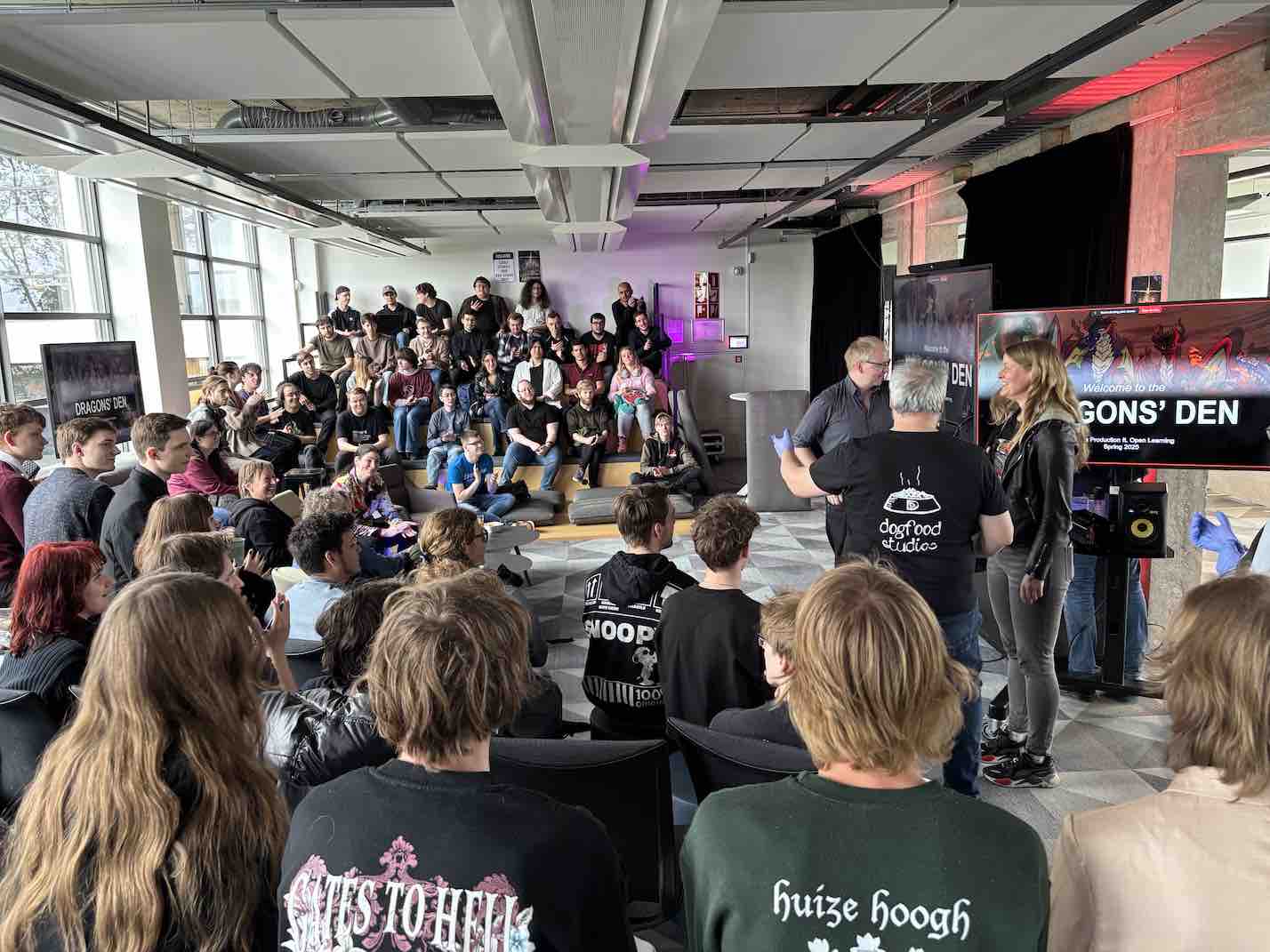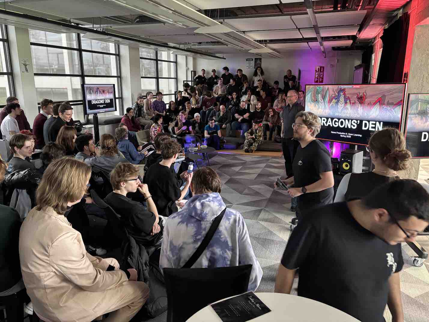 During the fiery showdown on April 25, the Game Production students approached the nest and presented their vertical slices. Each team stepped forward and faced the panel of industry exports.